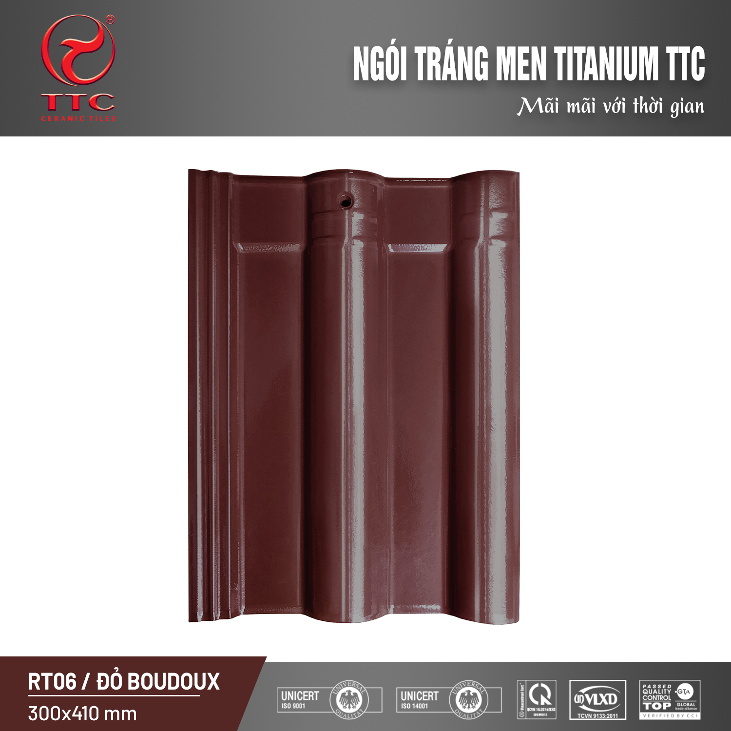 | Thương hiệu | NGÓI TRÁNG MEN TTC | Kích thước | 300x410 mm |