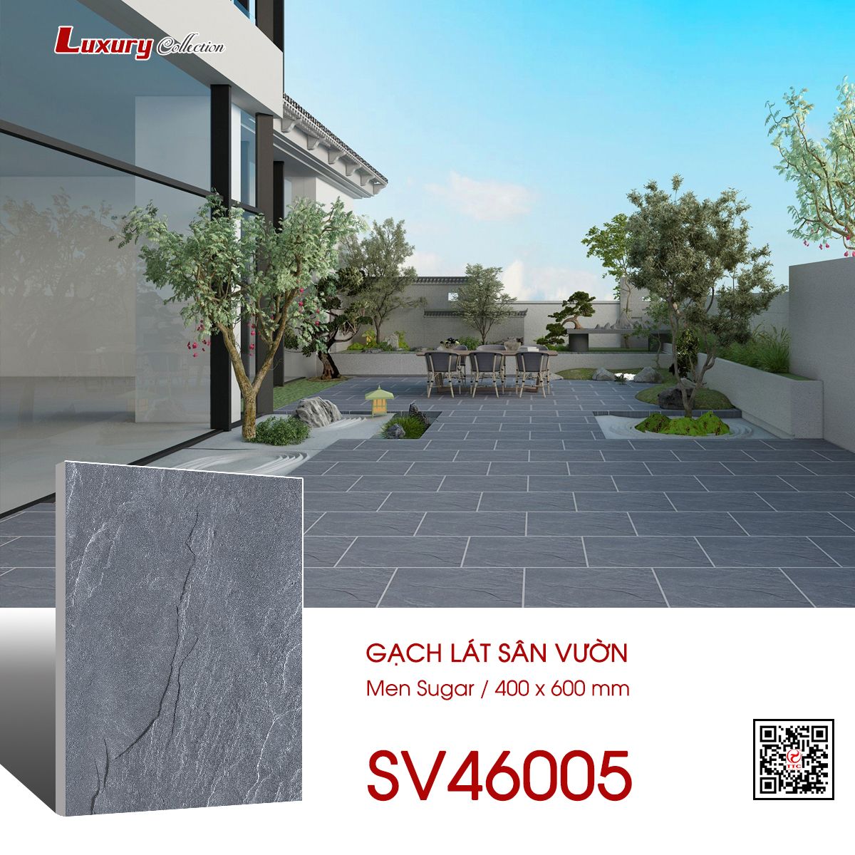 | Màu sắc | Màu xám nhạt vân đá tự nhiên | Dòng sản phẩm | Ngoại thất men sugar |